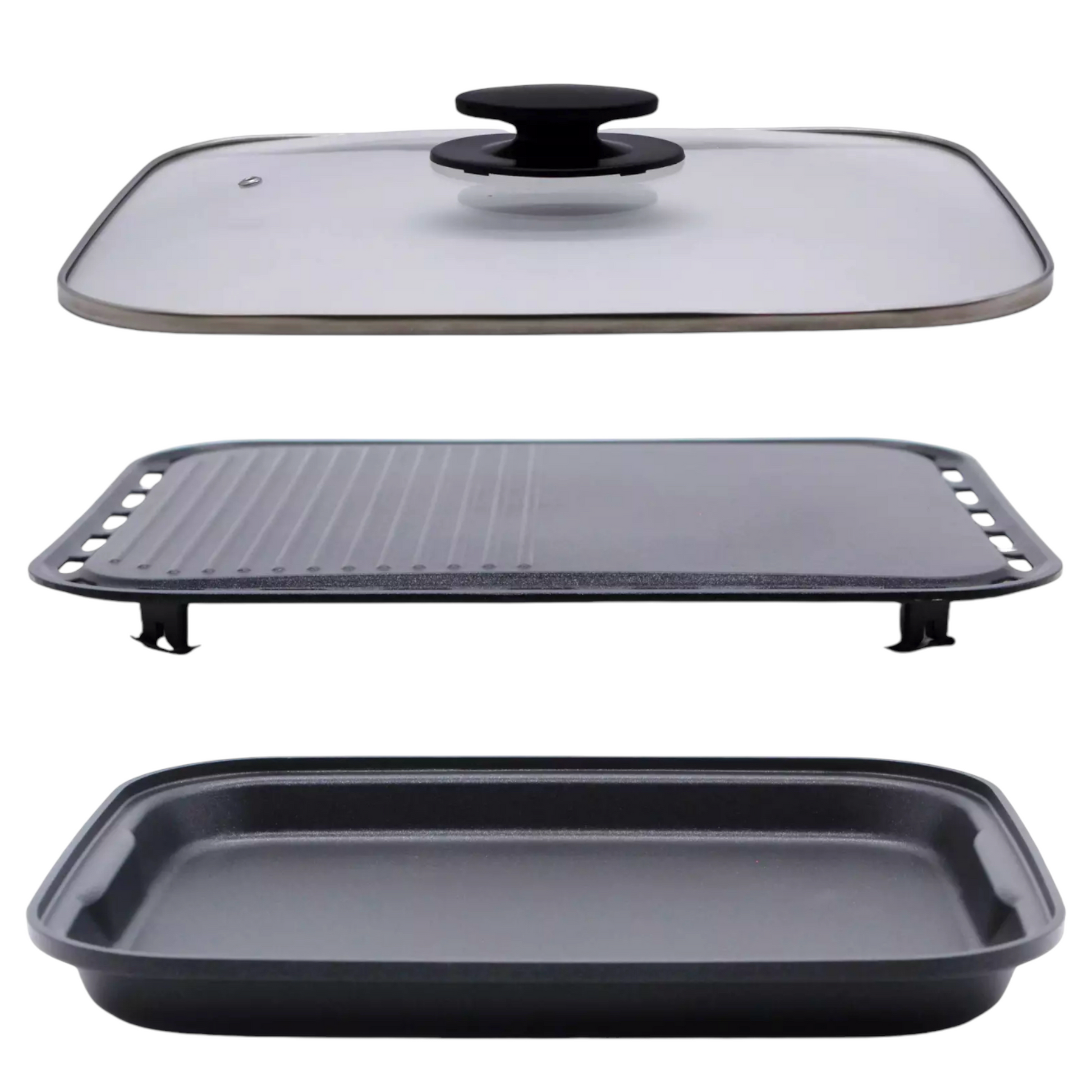 - Enthalten sind eine Grillplatte, Pfanne, Glasdeckel, Zange und Transportkoffer für komfortables Kochen und Grillen überall.