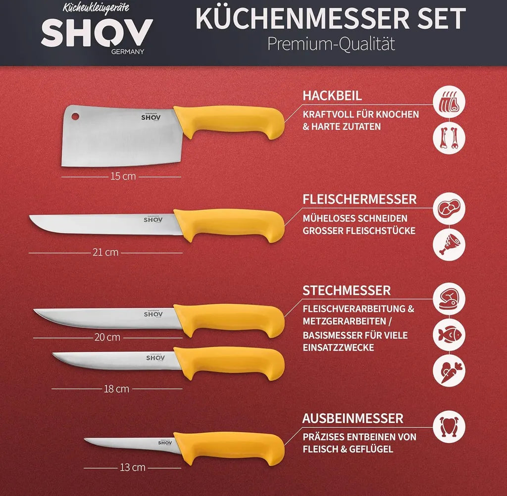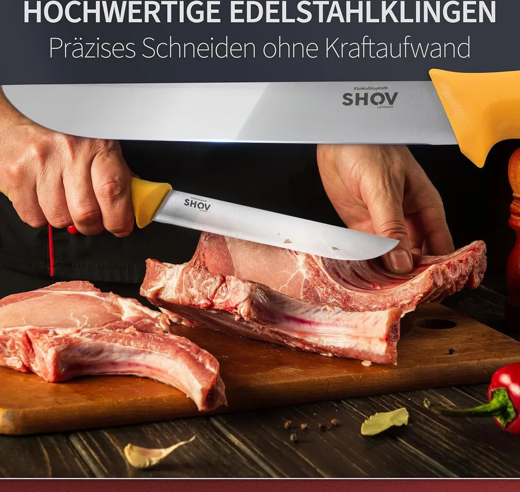 Egal, ob in der Profiküche, beim Metzger oder zu Hause – das SHOV Küchenmesser Set ist ein unverzichtbares Werkzeug für alle, die Wert auf höchste Qualität und Funktionalität legen. Es bietet Ihnen die perfekte Balance zwischen professionellem Anspruch und alltagstauglicher Vielseitigkeit.